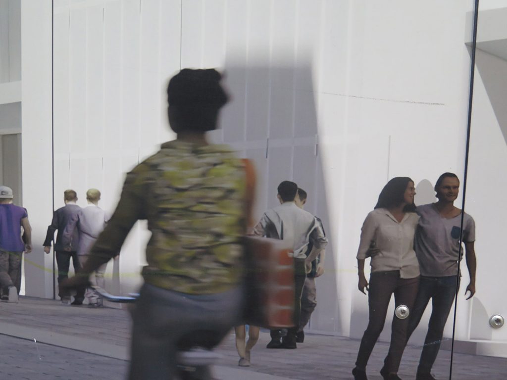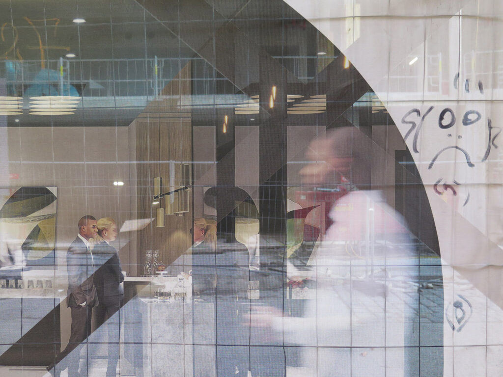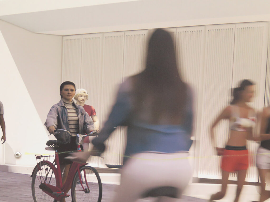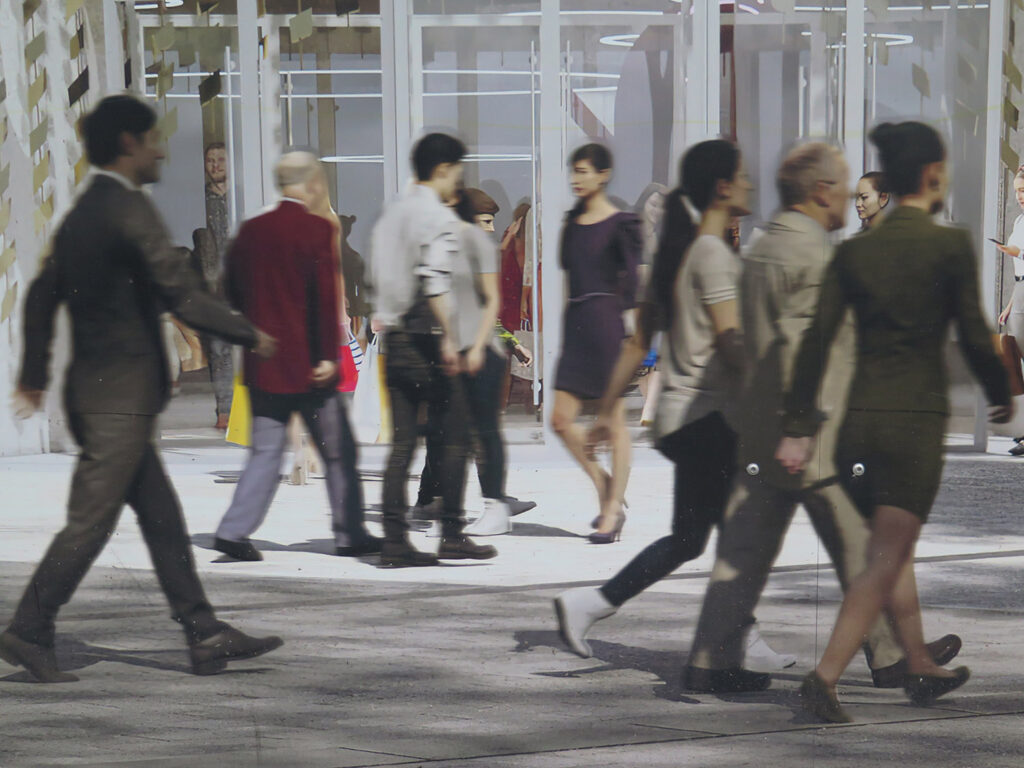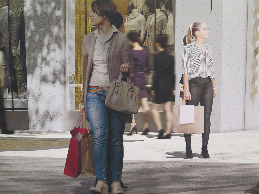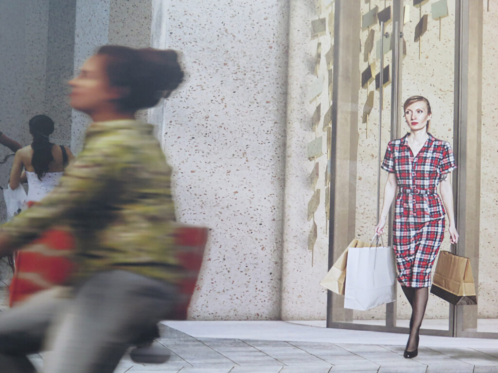 Sie sind vollbepackt mit Hand- und Einkaufstaschen, die Frauen, die in der Computersimulation das Wiener Nobel-Kaufhaus „Lamarr“ innen wie außen bevölkern. Lachende, junge Frauen in legerer Sommerbekleidung. Weiße, zahlungskräftige Frauen, selten auch People of Color – divers liegt ja im Trend. Sie alle säumen den Bauzaun, die den PassantInnen an der Adresse Mariahilfer Straße 10-18 Lust auf den „Luxury Department Store“ machen sollen. Doch ebendort herrschte 2004 Stillstand. Keine Bautätigkeit, keine Arbeiter, nur verlassene Betongerippe. Der durch die Machenschaften von René Benko verursache Crash der Signa Holding GmbH ließ den „Lamarr“-Traum jäh platzen. Die Immobilie wurde verkauft. Was bleibt, ist die Erinnerung an die Hochglanz-Renderings mit den Als-ob-Menschen einer idealisierten Wirtschaftswelt. Manche Nebenfiguren wirken fratzenhaft: Kapitalismuszombies. Realität und Imagination, Sein und Schein stoßen hier brutal aufeinander: Protz und Pleite.