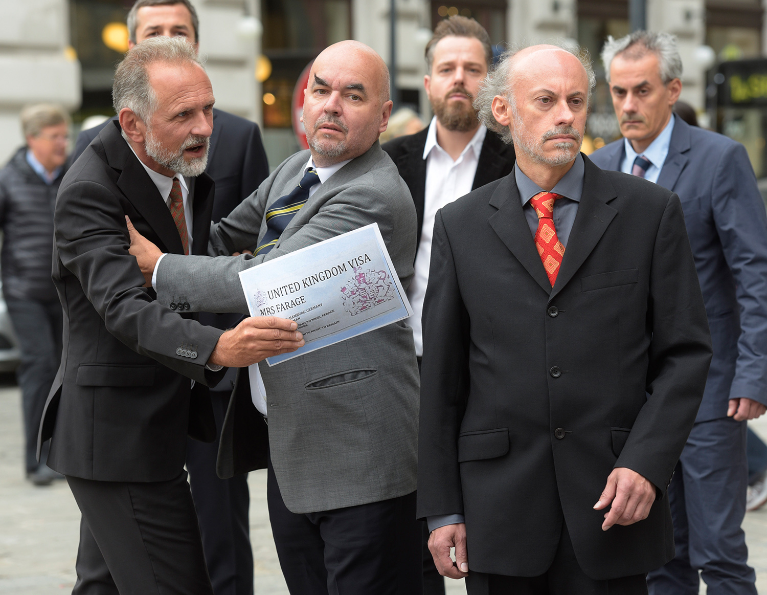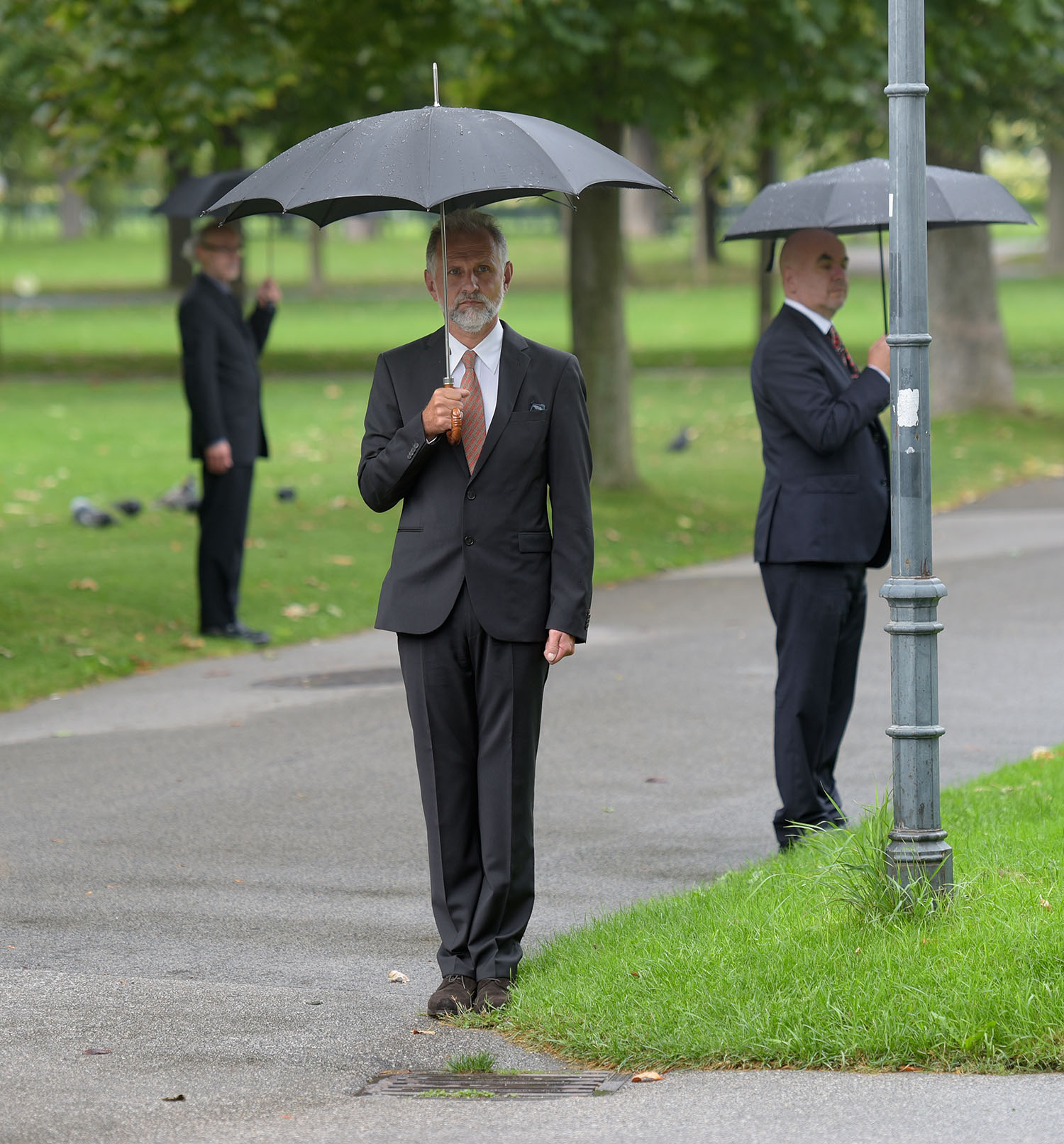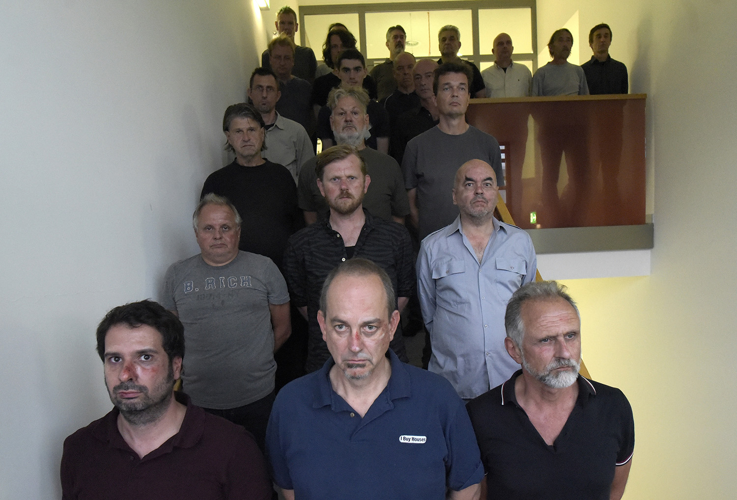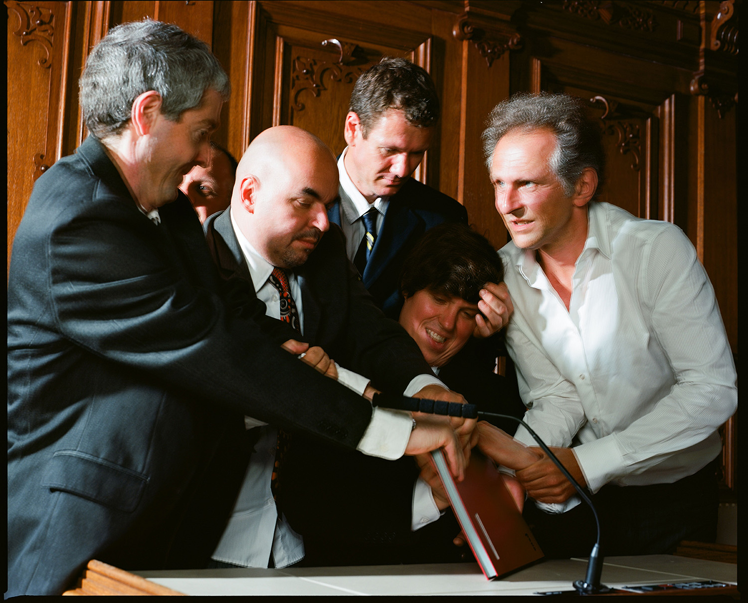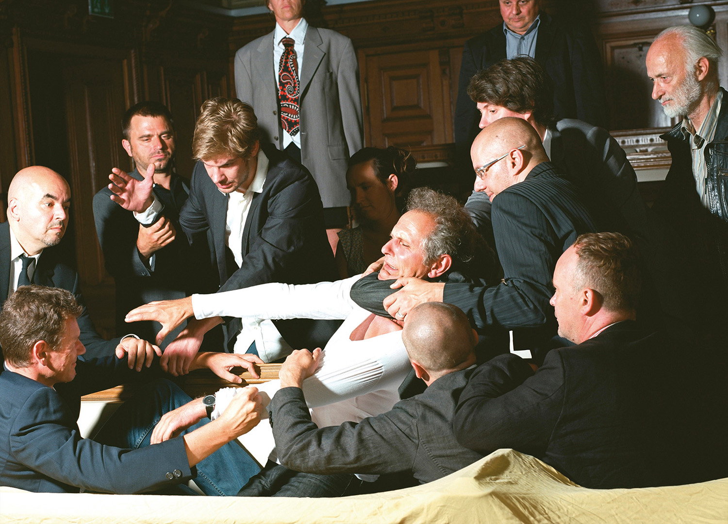 Wenn wir all diese Szenen auf den Bühnen der großen und der kleinen regionalen Politik Revue passieren lassen, fällt auf: Das politische Personal der Pressebilder ist überwiegend männlich. Unter die vielen Anzugträger mischen sich höchst selten Frauen. „Der Coup der tadellosen Männer“ ist also nicht nur ein Zitat, das auf ein bestimmtes Pressefoto nach dem Putschversuch in der Türkei gemünzt ist, sondern wohl auch – ein wenig augenzwinkernd – auf die breite Riege der „tadellosen Männer“, die Tag für Tag, Woche für Woche vor den Pressekameras Aufstellung nehmen. In ihren Reenactments beschäftigen sich die Künstler immer wieder mit der Choreografie der Macht. Akribisch buchstabieren sie das gestische Vokabular der Politik durch, präzise beobachten sie die Körpersprache der Politiker, nicht um diese zu desavouieren, sondern um das Gerüst der öffentlichen und der veröffentlichten Posen freizulegen.
